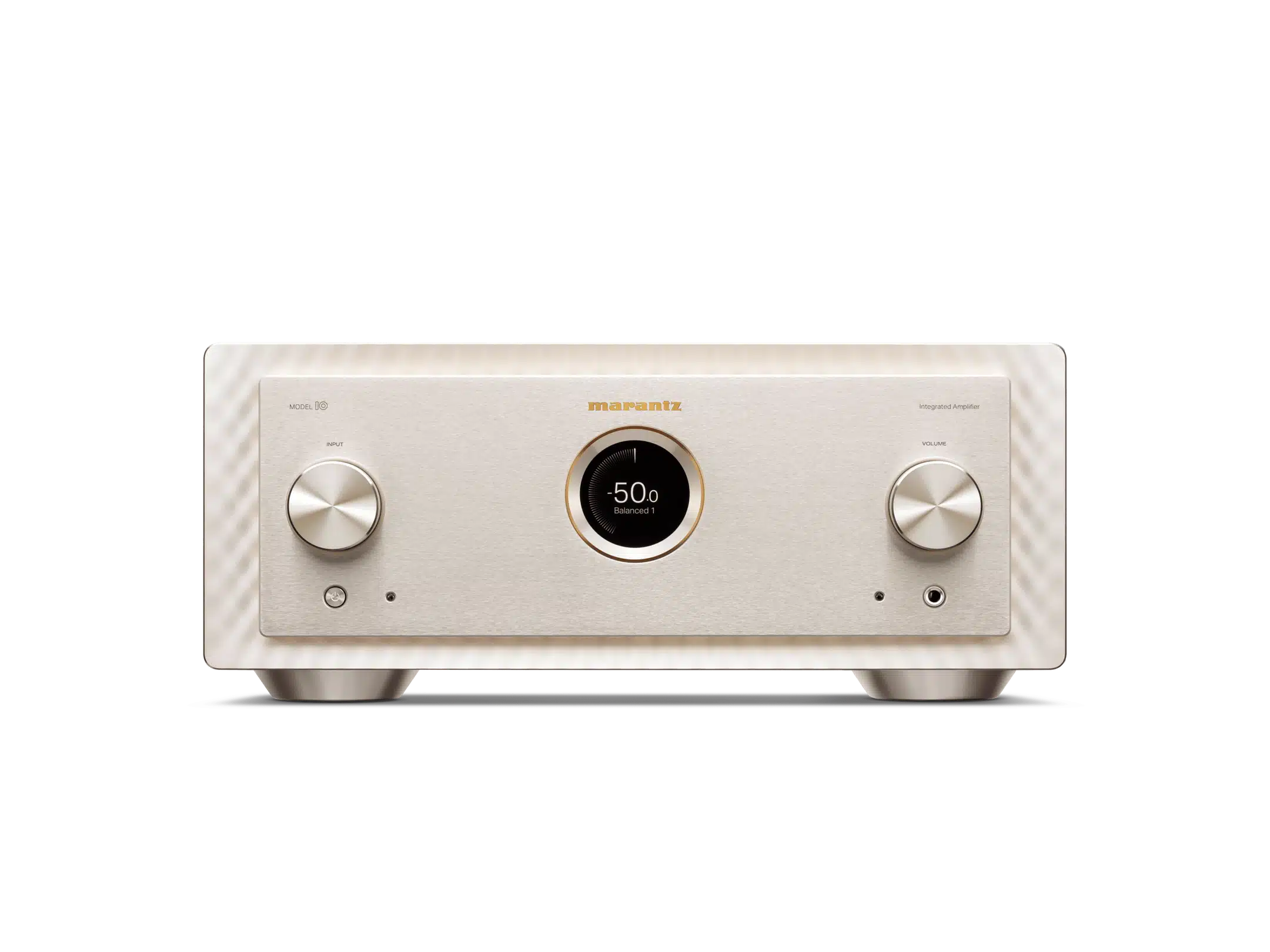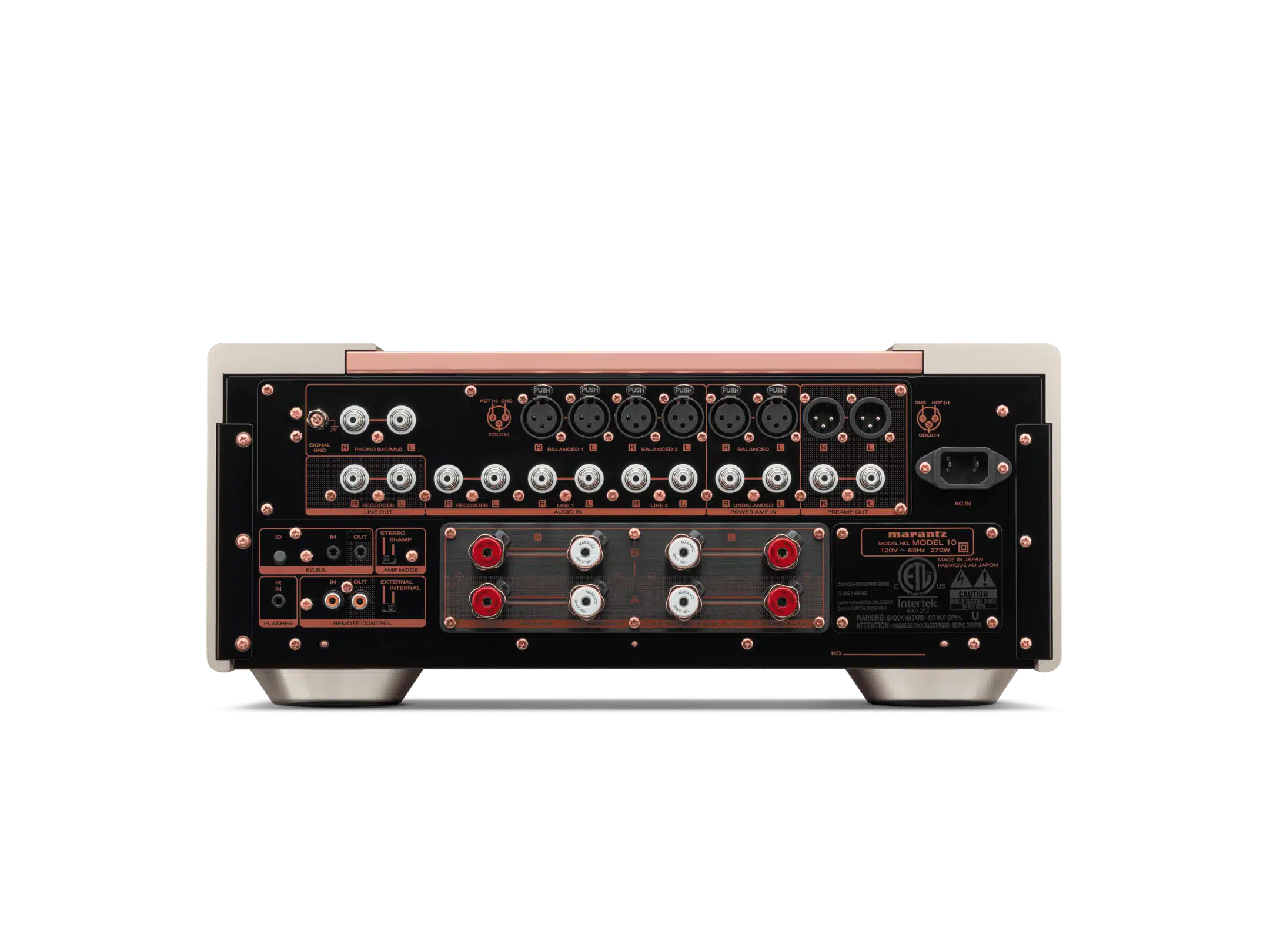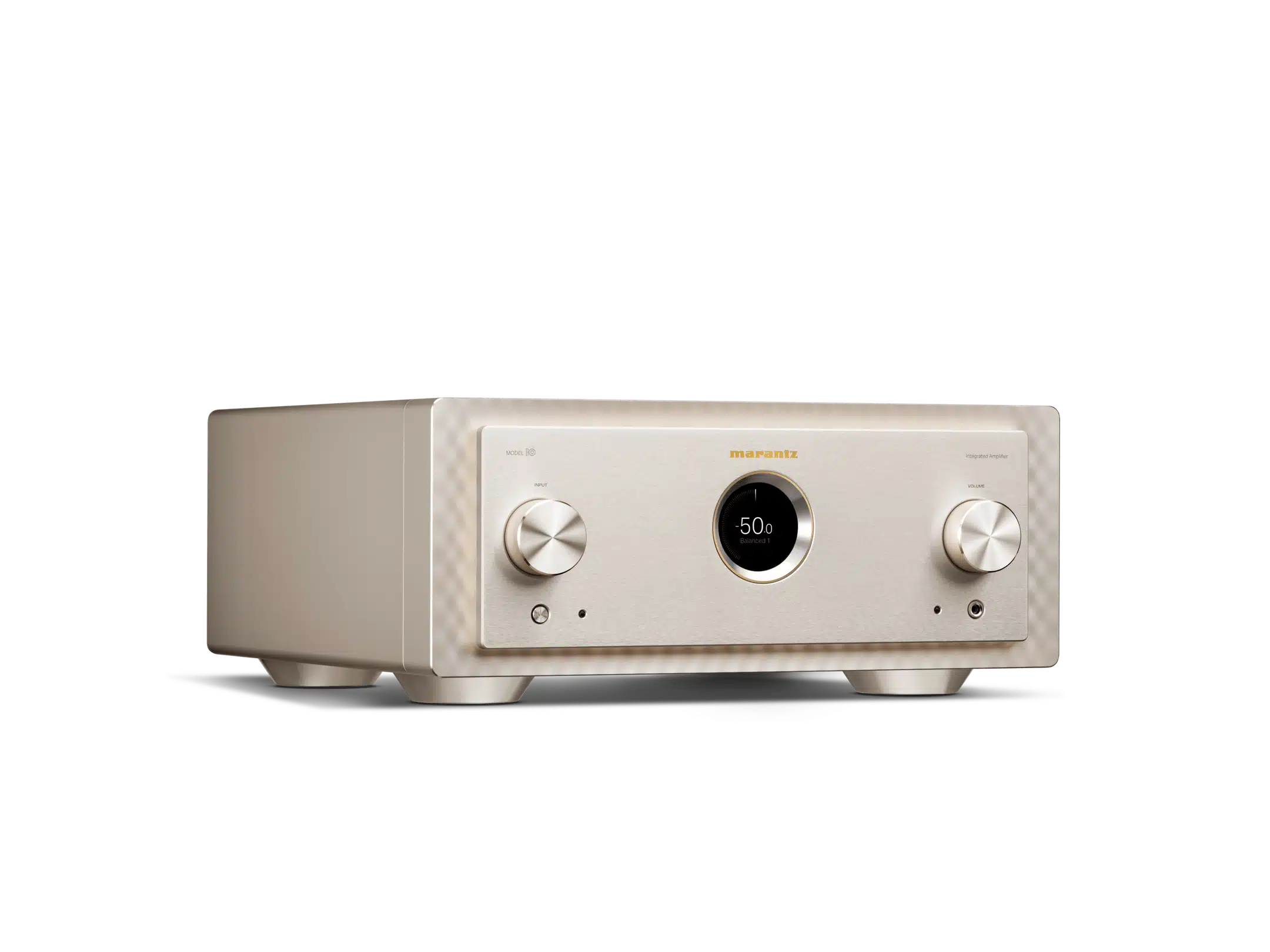 Conçu avec une façade en aluminium brossé, le MODEL 10 est enfermé dans un châssis triple couche cuivré avec une grille de protection éclairée. L’éclairage à l’intérieur de l’amplificateur met en valeur les circuits imprimés, les composants de haute qualité et le boîtier du transformateur spécialement conçu. En clin d’œil à l’ADN du design Marantz, le hublot du MODEL 10 abrite un écran OLED couleur haute résolution pour la sélection du volume et de l’entrée, ainsi qu’un level-mètre numérique qui se comporte comme les compteurs analogiques d’époque.