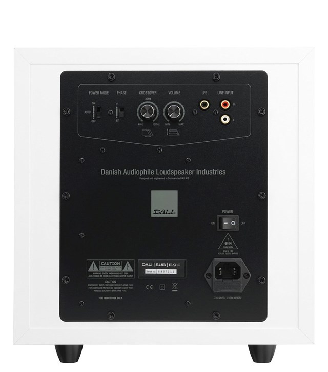 L’amplification digitale très soignée apporte un plus immense au SUB E-9F :170 Watts en continu et 220 Watts en impulsion. Mais la puissance n’est rien si elle n’est pas maîtrisée. Naturellement, le SUB E-9F est équipé de tous les réglages traditionnels: volume, fréquence de coupure (40-120 Hertz) et d’un sélecteur permettant d’ajuster le rendu sonore à l’acoustique de votre pièce d’écoute. Vous pourrez connecter votre caisson DALI à la sortie LFE de votre amplificateur home cinéma ou à partir d’un signal stéréo.
